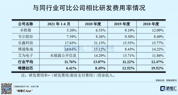 要知道,5G发展已是大势所趋,这对5G PA模组产品的性能及技术提出了更为苛刻的要求,这也意味着相关公司在5G产品研发上不容懈怠。而在此背景下,公司研发费用率持续走低,由2018年的19.52%下滑至2021年H1的6.41%,且低于同行业可比公司均值。