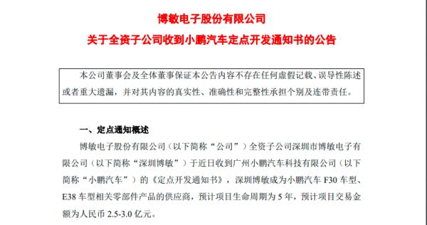 3月22日,博敏电子发布了一份名为《关于全资子公司收到小鹏汽车定点开发通知书的公告》,表示深圳博敏成为小鹏汽车 F30 车型、 E38车型相关零部件产品的供应商,预计项目生命周期为 5 年,预计项目交易额为人民币 2.5-3.0 亿元。