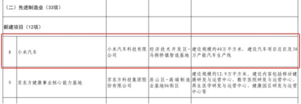 据此前官宣,小米汽车工厂位于北京亦庄新城(通州片区)马驹桥智造基地,项目总投资630亿元。根据北京市发布的2022年重点工程通知,小米汽车选址即在“经济技术开发区-马驹桥镇智造基地”,建设规模约40万㎡,建设汽车项目总目及30万产能汽车生产线,并于2022年开工建设。