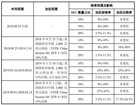 2018年-2020年间,赛维时代来自美国的收入占主营业务收入的比重分别为61.30%、65.57%及71.38%,美国加征关税目录涉及的公司产品共854个SPU,其中加征7.5%关税的产品涉及403个SPU,加征25%关税的产品涉及451个SPU。