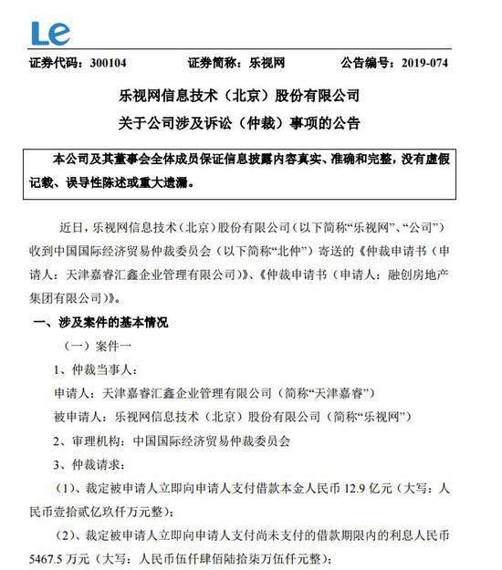 早在2018年12月6日,乐视网就曾披露,天津嘉睿和融创向公司发送了《催款函》、《通知书》,要求公司偿还相关本金及利息。截至目前,上述款项仍未偿还。