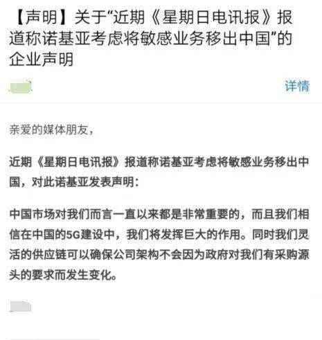 @环球时报【诺基亚爱立信要把敏感业务移出中国?官方回应否认此说法】近日,英国《星期日电讯报》刊登一篇重磅独家报道,宣称欧洲的通讯网络设备制造商诺基亚和爱立信正准备大规模调整公司的结构,甚至可能将公司分成两半去独立应对“东半球”和“西半球”的业务,以应对美国对中国在经贸上的持续发难而带来的潜在风险。
