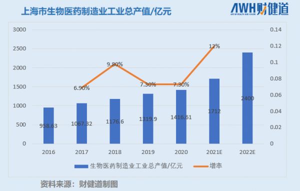 上海生物医药制造业工业总产值亦在稳步提升, 以2020年为例,上海市生物医药产业规模超过6000亿元,其中,生物医药制造业工业总产值突破1400亿元,预计2022年达到2400亿元。