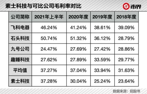 从公司的整体销售毛利率来看,2018年到2021上半年,素士科技的毛利率分别为23.64%、25.24%、30.04%及37.28%、低于业内可比公司。