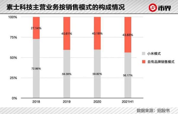 2018年到2021年上半年,素士科技通过小米模式获取的营收占比已经由72.86%下降至56.17%。而大力推广的自有品牌,由27.14%攀升至43.83%。