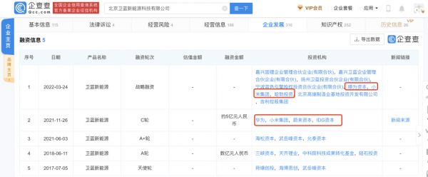 ▲卫蓝新能源股东新增小米和华为