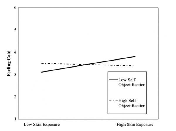 通过分析实时温度、女士们对温度的感知感受、皮肤裸露程度、当时的饮酒量(喝酒也会影响人对温度的感知)、如何看待自己的身体和外表等数据信息,研究者发现,随着自我物化程度的提高,人对自身的身体感知就会逐渐减弱。相比之下,同样是穿少了,自我物化程度较低(低于平均水平)的人就会觉得冷,即在同样的天气出门,皮肤裸露得越多,越觉得冷。