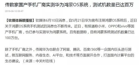 月初,业界消息称华为在100万部手机测试鸿蒙操作系统。这个规模令人惊讶,说明系统已经初步成型,到了大规模测试修改的阶段。近日,除早有预料的BAT等互联网生态巨头与华为联合测试,又传中国几大手机厂商都派出技术员入驻华为,实测鸿蒙系统。