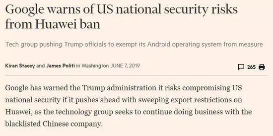 6月7日,英国《金融时报》称谷歌向美商务部游说,要求永久解除对华为的安卓禁令,以免给美国国家安全带来风险。谷歌的理由非常曲折,大致逻辑路线是:华为用不上安卓,就只好开发自己“不够安全”的混合系统,容易被窃听泄密;而美国人虽然自己用的手机是安全的,但也免不了要发送信息到这种不安全的华为手机上,就会有安全风险。谷歌为何搬出这么绕的理由替华为说话?一定是有大麻烦了。