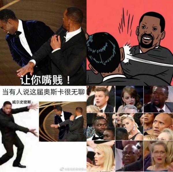 无论威尔·史密斯是生气还是作秀,他都已经成为新一代网络表情包。吃瓜群众生怕有人不看外国电影,还给威尔史密斯打人做了贴心本地化——好比吴京上台打了嘴谢楠的主持人张大大。