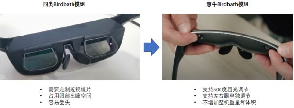 惠牛的BB模组还包含了:屈光调节、前方消漏光(保护隐私)、(光学树脂)耐摔、防雾等特性,综合性能优势获得了多家大品牌整机客户的认可与批量采购。