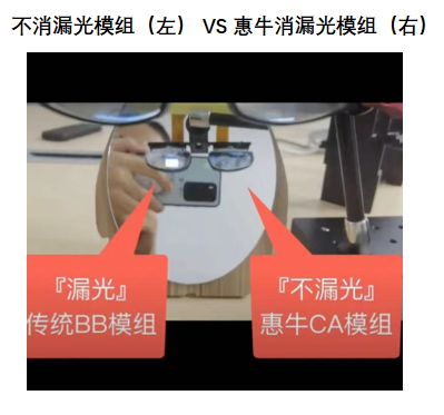 此外,针对市面上同类BB方案普遍存在前方漏光问题(下图左目),AR眼镜的前方会泄露消费者观看画面,惠牛最新研发的BB模组解决了该问题(下图右目),充分保护了眼镜使用者的隐私。