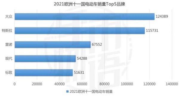 在欧洲市场,德国车企终于扳回一局。据EU-EVs统计的数据,2021年,挪威、德国、英国、法国、爱尔兰、西班牙、荷兰、瑞典、瑞士、丹麦、芬兰这11个欧洲主要国家共销售电动汽车853075辆,同比增长30.4%。其中,电动车销量最高的品牌是大众,累计销量为124389辆,市占率达14.6%;特斯拉位居第二,销量115731辆,市占率13.6%。