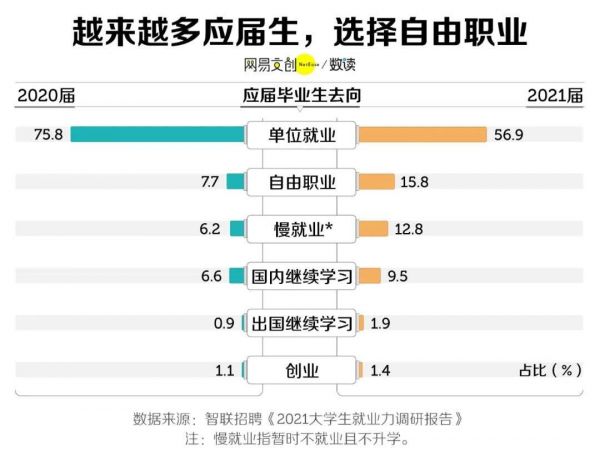 而到了 2021 届,情况便有所不同,单位就业的大学生只占到 56.9%,而自由职业者占比攀升至 15.8%,几乎翻了一倍。还有 12.8% 的应届生既不工作也不升学,成为了“家里蹲”一族 [3]。