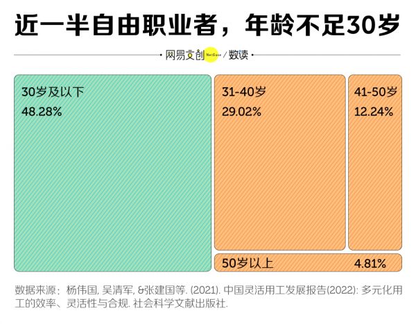 在这个群体中,年轻人占据半壁江山。《中国灵活用工发展报告》显示,48% 的人年龄不足 30 岁 [2]。而且年龄越大,自由职业者的占比越小。50 岁以上的自由职业者只占到了 4.81%。