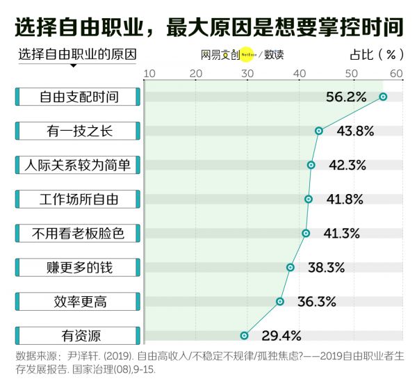 一项发布在《国家治理》上的调查显示,有 56.2% 的人认为选择自由职业是为了自由支配时间 [4]。