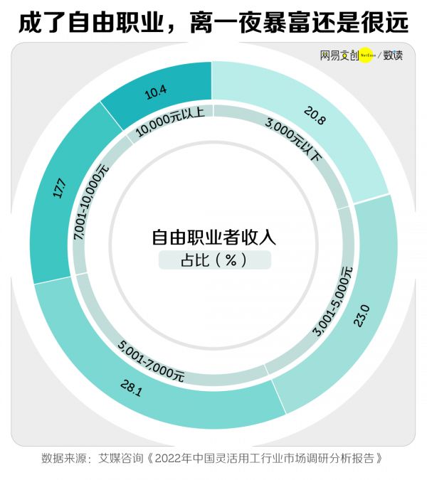 艾媒咨询发现,超过一半的自由职业者月收入不足 5000 元。有约 45% 的人,月收入在五千到一万元之间,而月薪过万的只有 10% [5]。