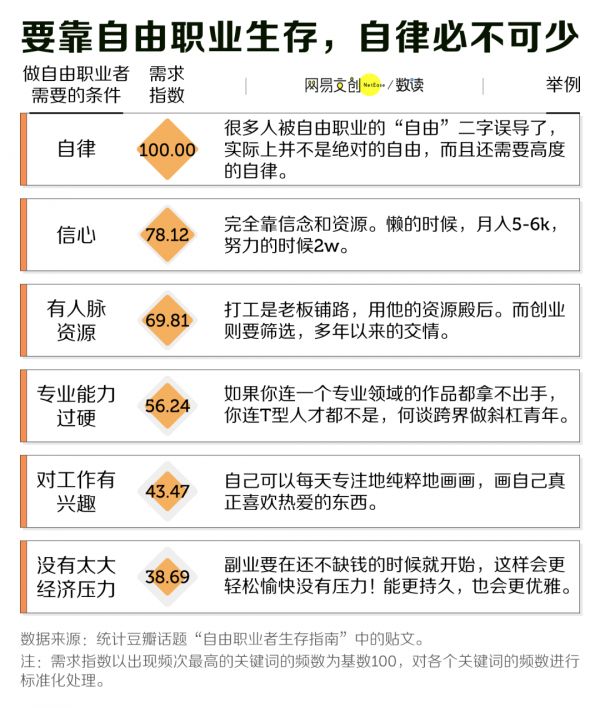 在豆瓣话题“自由职业者生存指南”中,谈到自由职业需要什么,人们提到最多的是自律。