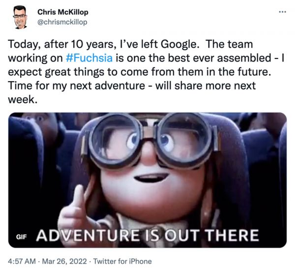 近日,谷歌 Fuchsia OS 操作系统负责人、开发总监 Chris McKillop 宣布即将离开公司。3 月 26 日,Chris McKillop 在推特上正式对外公布了这一消息并发文称“今天,在 10 年之后,我已经离开了 Google。Fuchsia 团队是有史以来最优秀的团队之一,我期待他们在未来能有更大的作为。是时候进行我的下一次冒险了。”目前,Fuchsia OS 官方团队也已正式在社交媒体上确认了 Chris McKillop 离职的消息。