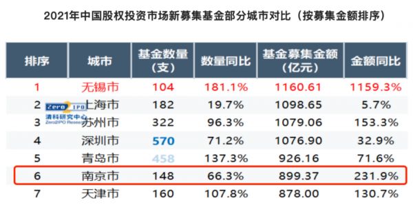 而从新募集基金上看,2021年南京共募集基金148支,总额899.37亿元,募资金额同比增长高达231.9%,募资总额位列全国第6。