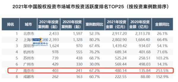 创投效应正在渐渐显示出来。清科研究中心数据显示,南京2021年投资金额同比增长高达253.5%,根据投资案例数进入了2021年中国股权投资市场投资活跃度TOP10,紧随北上广深等超一线城市之后。