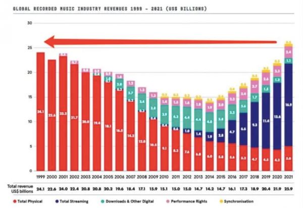 据国际唱片业协会(IFPI)发布的《全球音乐报告2022》显示,2021年全球音乐产业总收入达259亿美元,同比增长18.5%,而流媒体是全球增长的关键驱动力——2021年包含付费定语和广告支持在内的流媒体总收入达到168亿美元,增长24.3%,占全球录制音乐总收入的65.0%。