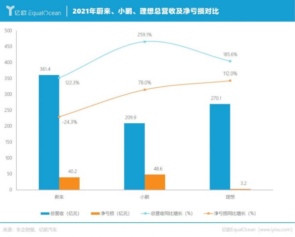 财报数据显示,2021年,蔚来总营收361.36 亿元,同比增长122.3%;理想总营收270.1亿元,同比增长185.6%;小鹏总营收虽为209.9亿元,在三家中排名第三,同比增长却达259.1%,位列第一。