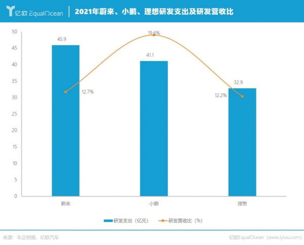 从研发占营收的比重来看,理想为12.2%,蔚来为12.7%,小鹏则为最高的19.6%。