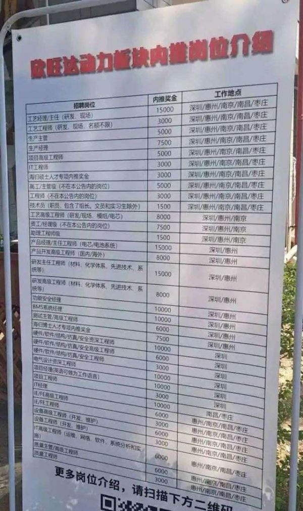 而内推的提成也非常可观。某动力电池公司内部信息显示,材料、系统等领域的研发主任工程师内推奖金为1.5万元,而动力板块副总级人才内推奖金为2万元。