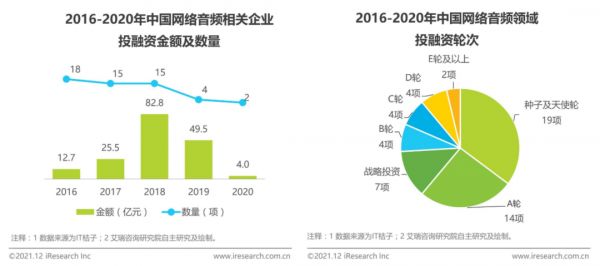 IT桔子统计的数据显示,2020年我国在线音频行业相关企业的投融资数量及金额跌至谷底,分别为2起和4亿元,和2018年巅峰时期的15起和82.8亿有天渊之别。