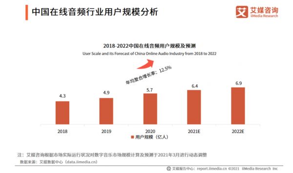 艾媒咨询统计的数据显示,2018至2022年中国在线音频用户规模会保持12.5%的年均复合增长率,预计2022年达到6.9亿,同期的市场规模则有望达到349亿。