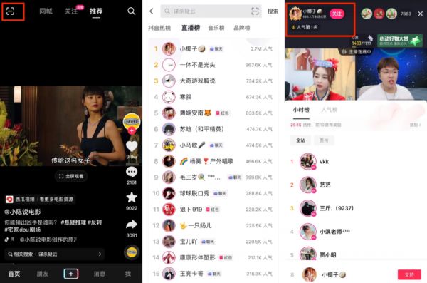 所以,抖音降低了直播权重。从2021年11月的灰度测试新版本,抖音就把客户端首页的直播入口换成了“扫一扫”。直播间的入口除了推荐流以外,只有“直播榜”和“关注”了。