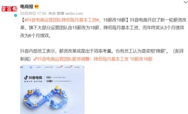 3月10日,界面新闻报道称,抖音电商运营团队已经在个人薪资总额不变的前提下,将薪资结构从15薪调整为18薪。这意味着,员工每月基本工资降低了17%。变相“降薪”无非就是在激励团队更加努力地完成绩效。