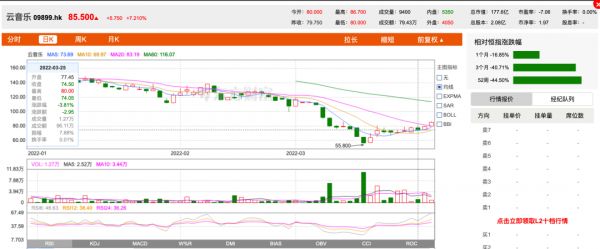 自上市开始,网易云音乐的股价就一直不断下跌。截至3月30日收盘,网易云音乐的股价 已经由上市的205港元每股跌至90.5港元每股, 市值也由425.9亿港元下降至188.0亿 港元,几个月间市值蒸发了55.8%。