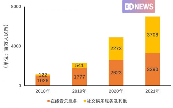 虽然在财报中未显示,但网易云音乐社交娱乐业务的毛利率据推测较低。2021年,网易云音乐的营业成本由2020年的55亿元增长24.8%至69亿元,增加了14亿,其中12亿是来自于内容服务成本的增长,而内容服务成本的增长,则是因为收入分成费随着社交娱乐服务收入的增长而增长,可见通过社交娱乐服务走向整体盈利也不容易。