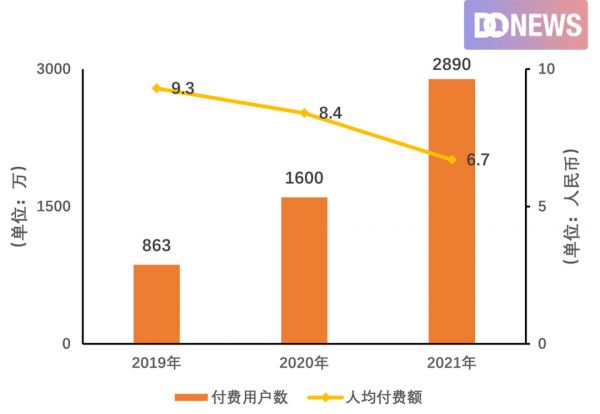 虽然网易云音乐付 费会员有着大幅增长,2019年为863万,之后两年分别增长至1600万、2890万,2021年付费率达到15.8%,但其人均付费额也从2019年的9.3元降至2020年的8.4元,2021年进一步降到6.7元。网易云音乐在财报中对此表示:“主要由于我们于2020年至2021年与其他平台推出联合会员套餐,我们的会员以折扣出售,以推销我们的订阅、以扩大服务覆盖面”。也就是说,靠折扣让利的促销活动虽然提高了付费率,但却没有带来真正的活跃用户,也没能增加实际收入。