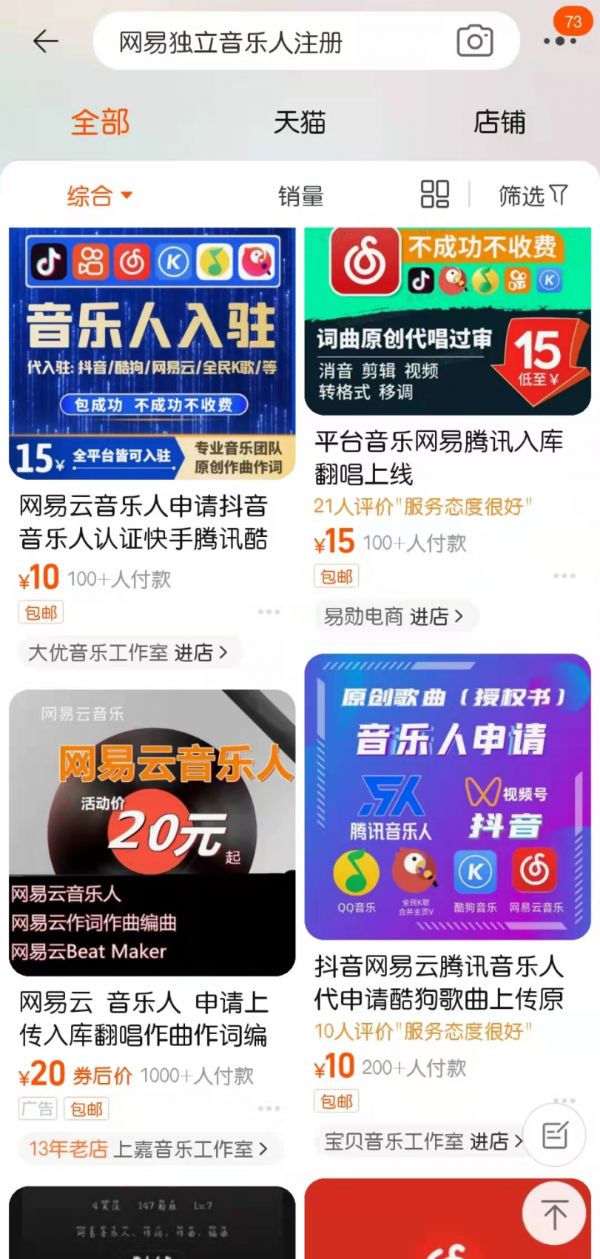 由于网易云音乐人的门槛低设,带来了平台音乐人中滥竽充数的问题。以词曲作者为例,提交基本资料之后,仅提供一段歌词就可认证,无需提供任何自制音乐作品或音乐内容著作权证明,甚至,淘宝上还能找到专门代申请业务,最低10元就能 帮搞定。