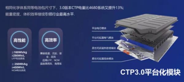 常规电池包一般是先将单体电芯固定成电池模组,然后再将多个模组移入电池箱体。而CTP (Cell to Pack,无模组动力电池包) 技术是将电芯直接集成到电池包,尽量减少模组,通过提升电池包的空间利用率来提升能量密度,并实现降本。