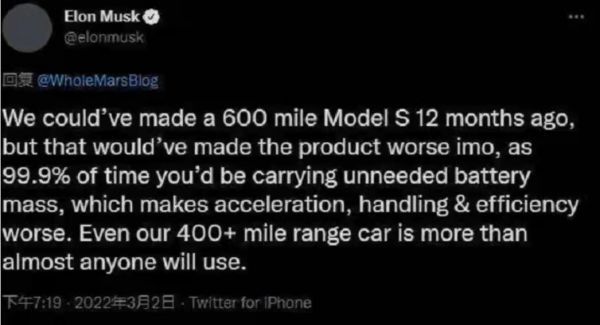 马斯克前不久在推特上表示,早在12个月之前,特斯拉就可以生产出续航600英里 (965公里) 的Model S,但这根本没必要,因为续航400英里 (643公里) 的Model S可以兼顾体验和效率的平衡。