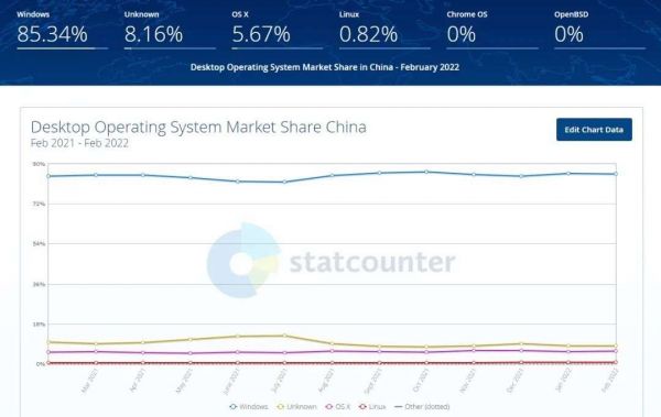 据 Statcounter 的数据,截至 2022 年 2 月,Windows 占据中国的桌面操作系统 85% 以上的份额,macOS 占得 5.67%,两家国际主流操作系统加起来的份额超过 90%。