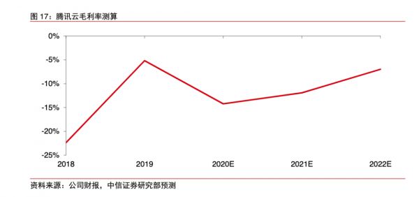 这与机构的估测基本符合,此前在2020年9月,中信证券曾做过测算,2020年至2022年腾讯云毛利率仍将为负,分别为-14%、-7%和-7%。
