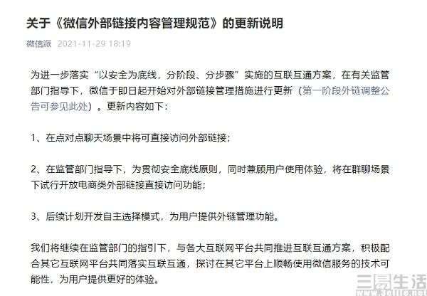 自去年9月工信部召开“屏蔽网址链接问题行政指导会”后,几乎每隔一段时间,微信宣布开放第三方外链、阿里旗下APP接入微信支付等举动,都会引发外界的诸多关注。不知不觉间,微信私聊与群聊中已经能够直接打开淘宝的商品链接,一改此前的“火星文”乱码,同时用户也能直接下单了;而通过复制链接,抖音里的短视频也能够直接在微信窗口内观看,这无疑大幅提升了用户体验。