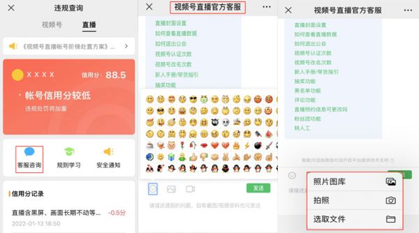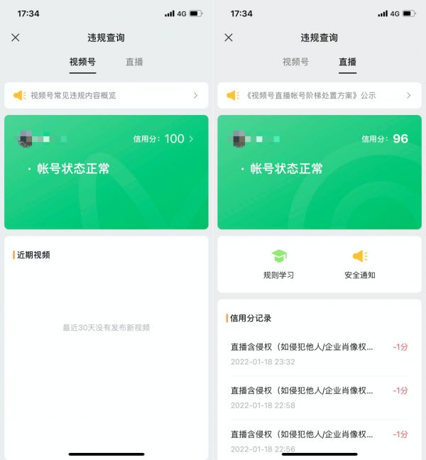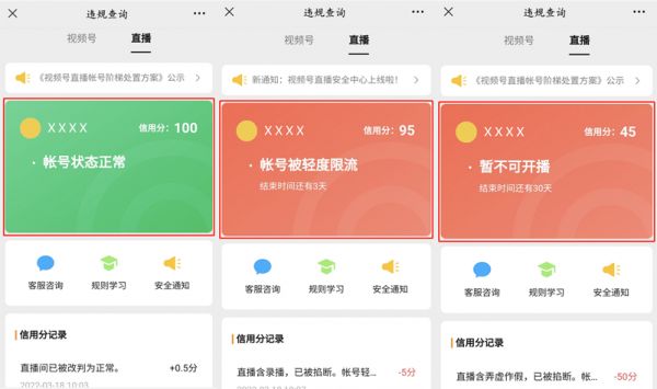 近日,微信正在内测「 视频号直播安全中心 」,部分被灰度 的用户已经发现,他们可以通过查询信用分的方式,了解账号状态、安全信息分、违规记录等信息,并支持自助申诉、咨询客服、常见问题解答等便捷服务。