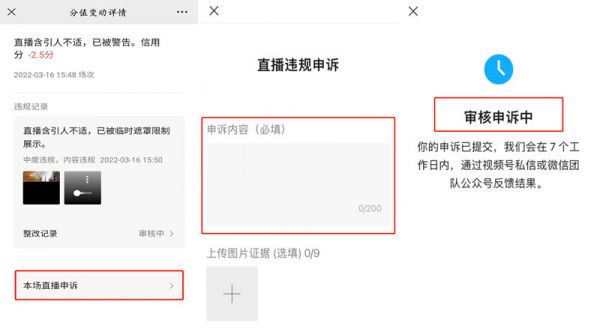 如果对处罚结果有异议,则可点击违规记录下方的本场 直播申诉>填写申诉内容>提交 ,平台将在7个工作日内复核,复核结果将通过视频号私信或微信团队公众号反馈通知。此前,申诉方式是以“视频号直播申诉”为主题发送邮件到:weixinlive@tencent.com,平台会在1到2个工作日内复核,如申诉成功,违规积分将不计入信用分结算中。
