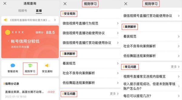 第四,新增规则学习板块。 该板块将提供最新的平台规范内容和常见违规案例解析。 此外,“常见问题”中还包括了收入体现、开播教学、异常处理等重点话题。看得出,该板块对新手格外友好,可让新手直播尽量避免在无意间踩坑,同时也在帮助新手快速入门和进阶。正如前文提到,主播可以主动参与规则学习的任务教学,还可增加自己的安全信用分。