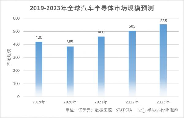 2019-2023年全球汽车半导体市场规模预测; 半导体行业观察制图