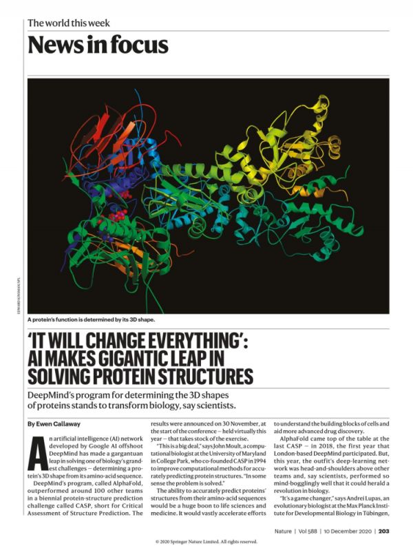 2020年末的一期《Nature》封面,罕见的用上了「它将改变一切」的题语来描述一项关于蛋白质的研究难题终于被攻克,攻克它的正是DeepMind。