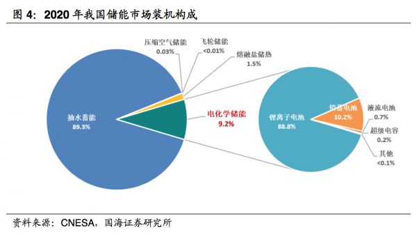 从储能结构来看,我国当前还是以抽水蓄电为主——用电低谷时,通过电力将水从下水库抽至上水库,用电高峰再放水发电。2020年,我国抽水蓄电的比例达到近90%,第二位则是电化学储能,包括锂离子电池、铅蓄电池、液流电池等技术。