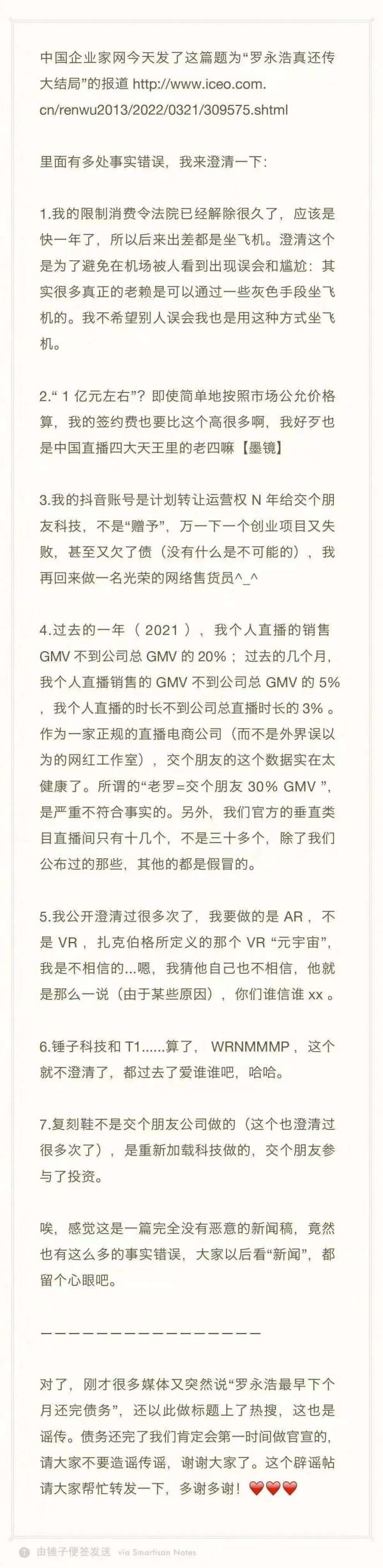 3月21日,罗永浩回应了“天价分手费”的传闻,还特别提出:“抖音账号是计划转让运营权N年给交个朋友科技,不是‘赠予’。”