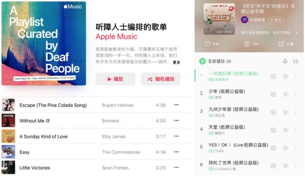 苹果音乐听障人士编排的歌单(左)与QQ音乐低频公益专辑(右)